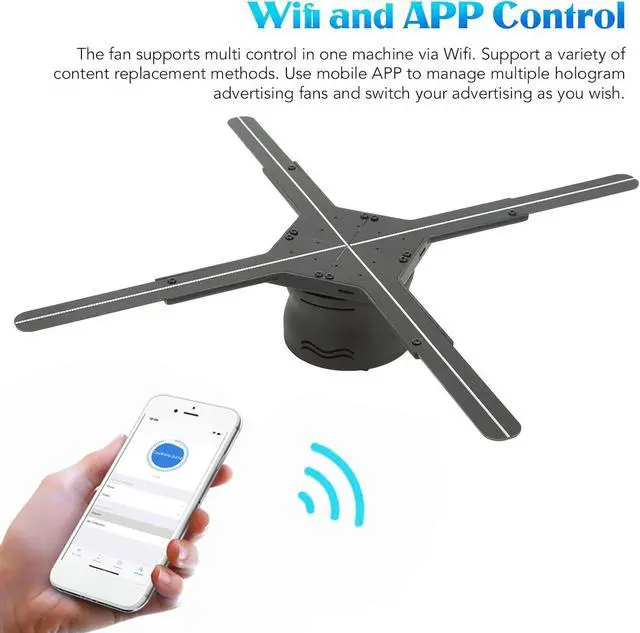 Wifi and APP Control: The 3D hologram fan supports multi control in one machine via Wifi. Support a variety of content replacement methods. Use mobile APP to manage multiple hologram advertising fans and switch your advertising as you wish.