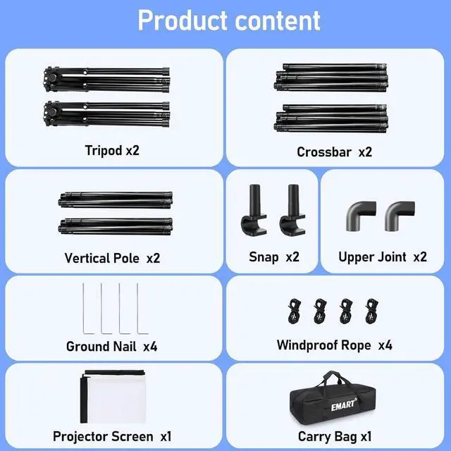 Super Value AccessoriesThe projector screen stand set includes a carrying bag, making it easy to transport anywhere for family trips, camping, or backyard movie nights. Equipped with ground stakes and wind-resistant ropes, you can use it outdoors without any worries