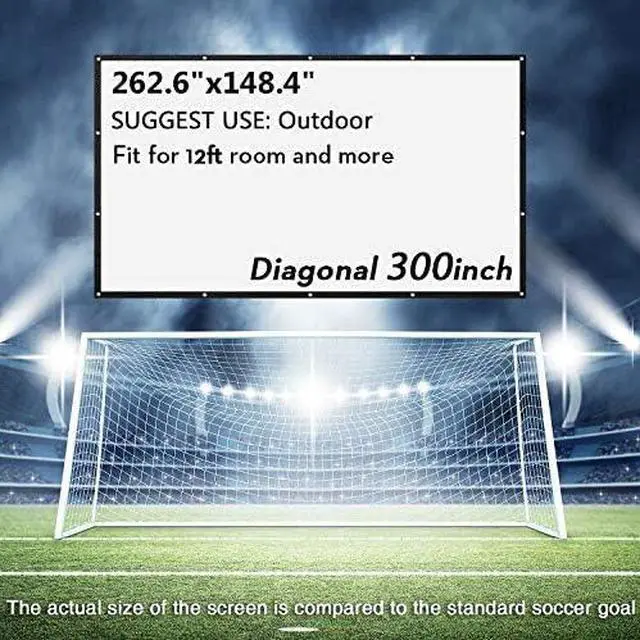 PERFECT SIZE 300 INCHES, format: 16: 9, display area: 667x377cm / 262.6'' x 148.4'' fits for 11ft, 12ft, 13 ft rooms and more. Foldable and portable to use both indoor and outdoor. No matter for home theaters, classrooms, conferences, or outdoor movie parties, one NIERBO projector screen meet all needs.