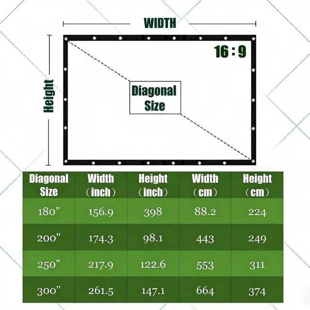 Extra Large Thick Canvas Projector Screen: Heavy-duty thick canvas material ensures sharp, vibrant images on a massive 200/250/300 inch 16:9 screen ideal for outdoor movies, backyard gatherings, camping trips, tailgate parties, and big sports viewing events.