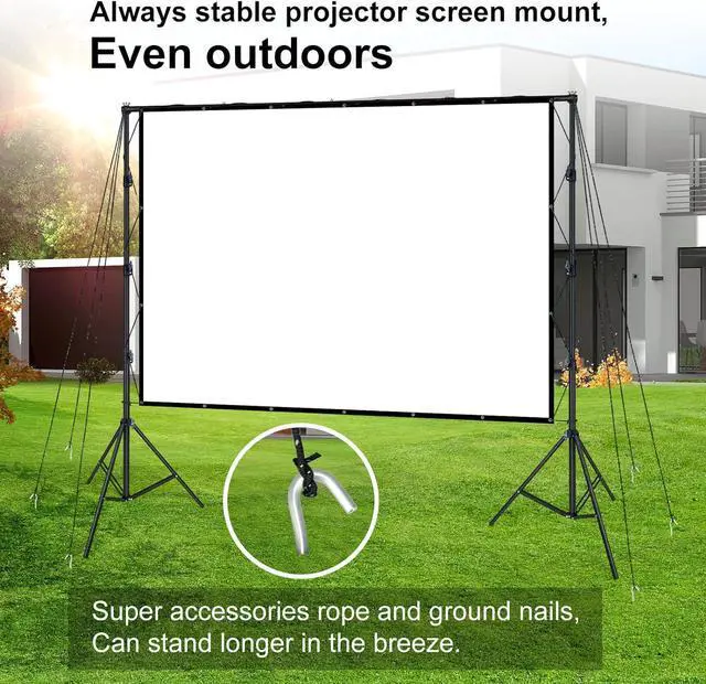 4K HD 16:9 Screen: White screen is thickened and smooth; Crease-free projector screen with brighter colors; Quality is strictly controlled for outdoor projection screens; 160 degree viewing angle; True color displayed by the high-reduction projection