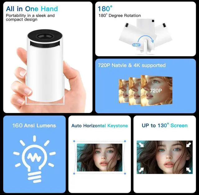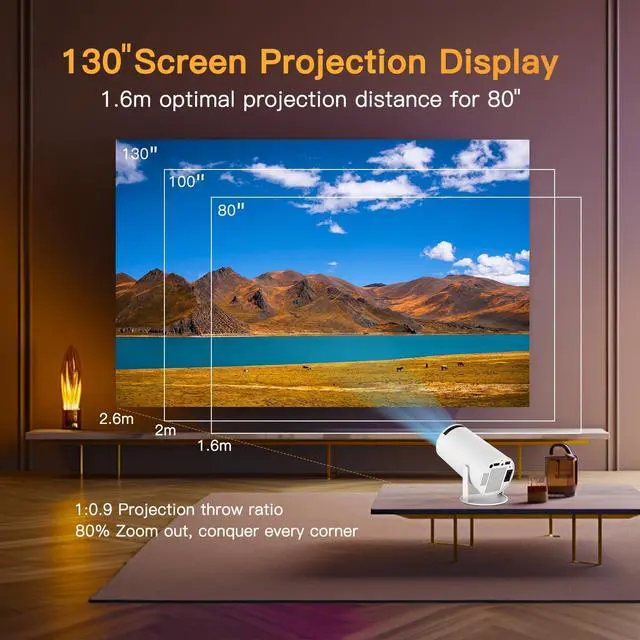 Auto Keystone, 180°Rotation & Digital ZoomNo Mount Needed, this portable projector allows seamless 180° rotation for screens, wall, ceiling, or even floor projections. Auto keystone correction ensures aligned visuals, adjust the focus through the focus wheels to quickly get the clear picture. The projection size is 30-200 inches