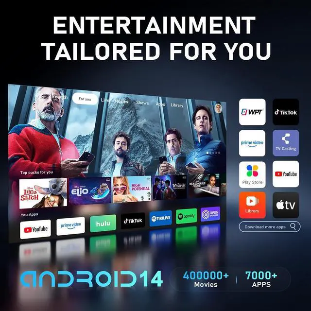 Instant Entertainment Hub with Android 14 Powered by the latest Android 14, this smart projector is ready to roll the moment you unbox it. We've pre-loaded your favorite streaming apps, so you can jump straight into movies, shows, live sports, and music on YouTube, Prime Video, and more. Download new apps in secondsno extra gadgets needed. It's the easiest way to turn any room into your personal theater for movie night.