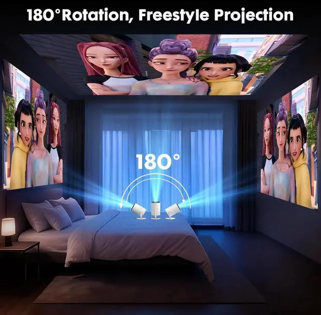 Immersive Dolby Sound & 180° Flexible ProjectionBuilt-in powerful stereo speakers deliver surprising bass and clear treble for an immersive viewing experience. This portable projector can rotate a full 180°, allowing you to project onto a wall or even the ceiling. Its compact and lightweight design makes it perfect for both indoor and outdoor use