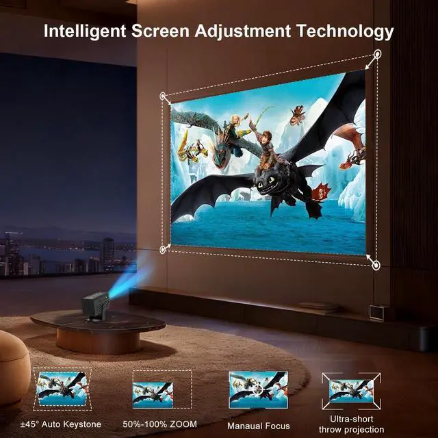 Automatic Trapezoid Correction With our intelligent electric trapezoid correction function, you can always enjoy a perfectly aligned visual effect every time. This projector automatically adjusts in just 3 seconds, ensuring a perfect image display and allowing you to place it freely.