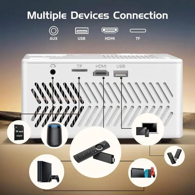Dual-Mode Bluetooth 5.2 Audio System Transform your space with theater-quality sound: Audio Output Mode: Pair with premium Bluetooth speakers for immersive 360° surround sound. Speaker Mode: Use the projector itself as a powerful Bluetooth speaker - ideal for outdoor parties or background music.