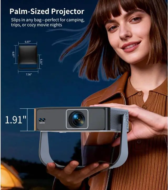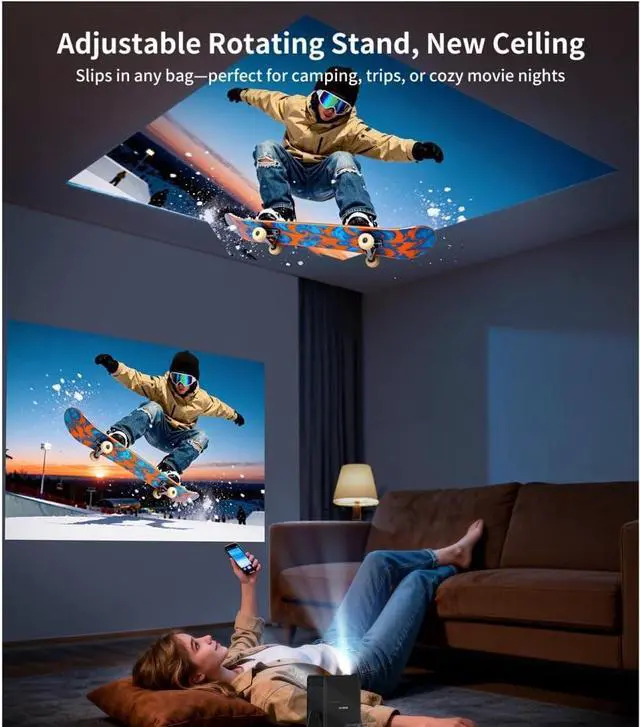[Pocket-Sized & Ultra-Portable Design] Weighing only 1.9 lbs and as compact as an i Pad Mini, the S36 easily fits into a handbag, making it ideal for outdoor movie nights and travel. The built-in 330° rotatable stand allows projection on walls, ceilings, or outdoor screens. Multiple mounting options, including an M6 screw hole for ceiling installation, give you full flexibility to enjoy a big-screen experience anywhere.