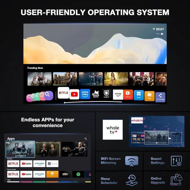 [Smart Projector OS Built to Last] Many projectors use basic Android systems that are unofficial, unstable, and lack long-term support, often becoming outdated quickly. Others rely on limited licensed systems, which are compliant but typically slow and restricted to a small number of apps, many of which are web-based. Even some Google TV projectors offer broader app access but can be expensive and less responsive over time due to heavier system requirements. The S36 projector with Samrt Whale OS is designed to solve these issues.