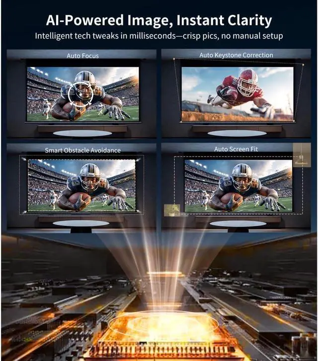 [AI Auto-Setup Instant Perfect Image] The S36s Auto-Setup system includes auto-focus, auto keystone correction, obstacle avoidance, screen alignment, and up to 50% zoom-out. Place it anywhereeven upside downand the projector automatically adjusts the image in seconds. Manual adjustment is optional, and once the image is set, auto-focus and keystone can be turned off to maintain a stable display. With a 1.19:1 throw ratio, it creates a large, clear image even in small spaces. Whether on a wall, ceiling, or screen, simply power on, relax, and enjoy an immersive home cinema experience.