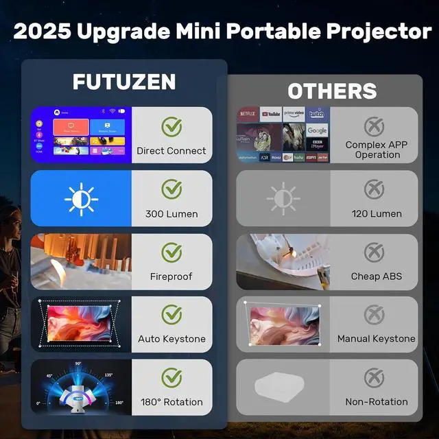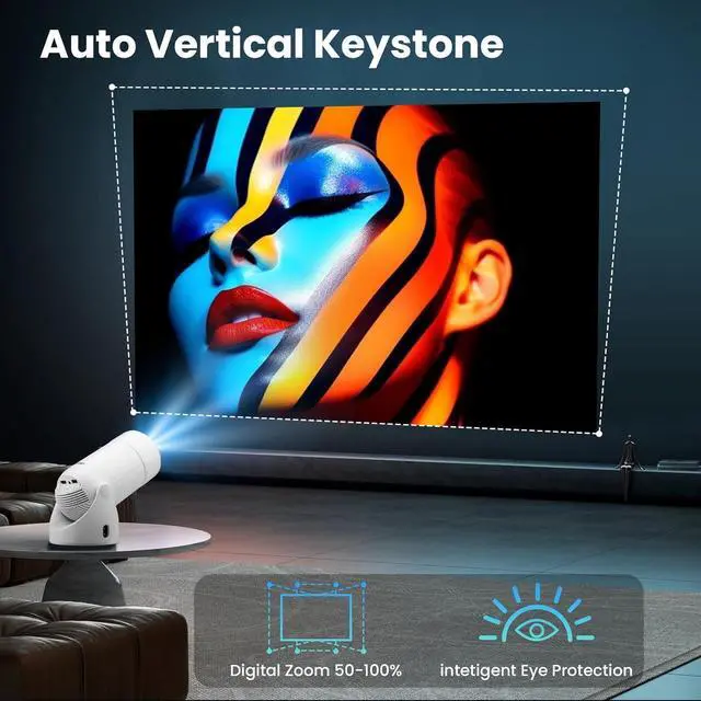 Ultra-Portable & Flexible Design: Measuring just 4.33 × 4.33 × 8.84 inches and weighing only 1.8 lb, this highly compact mini portable projector is designed for true mobility. It slips easily into a backpack or handbag, making it perfect for travel, dorm rooms, or compact living spaces. The small projector body rotates 180° for ceiling, wall, or screen projectionno mount needed. Auto keystone correction keeps the image aligned, and manual focus ensures sharpness in any setting.