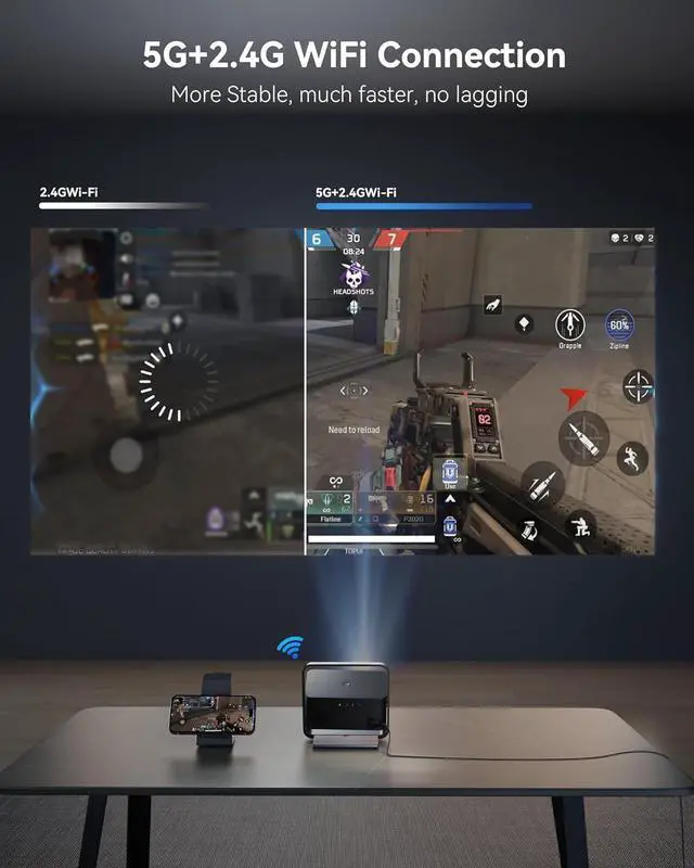 [Latest WiFi 6 & Bluetooth 5.2] This mini projector features WiFi 6 connection for smooth video playback and lag-free gaming experience. In addition, it has Bluetooth capability, which makes it easy to connect devices such as headphones, speakers and computers. This portable projector also supports Dolby Digital audio decoding. Connect it to Dolby-enabled speakers to enjoy an immersive, cinema-quality experience that makes you feel like you're right in the movie.