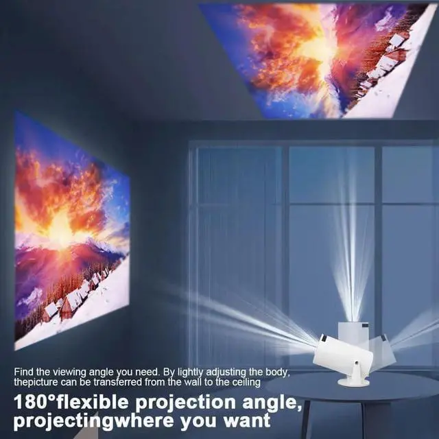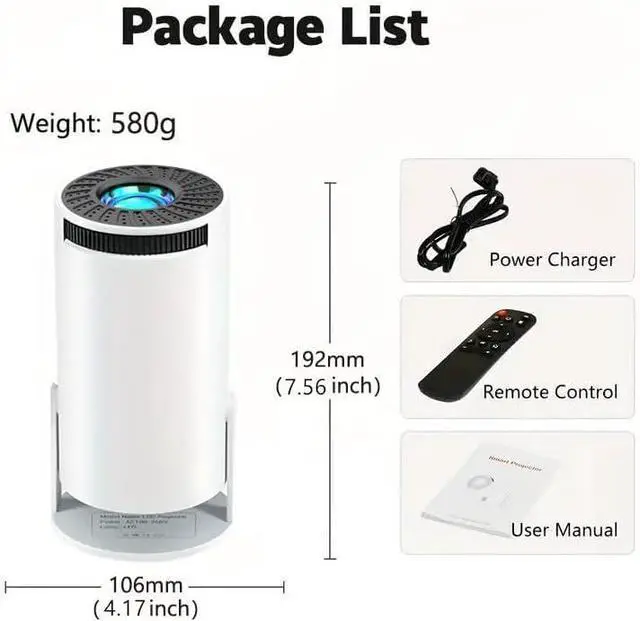 Mini video Projector with WiFi and Bluetooth, 4K 1080P, Android 11.0 TV OS Build-in wifi and bluetooth,wireless connect with your phone,laptop,tablet freely. Come with a remote controller Correct the screen picture easliy by remote controller.30-150INCH size picture adjustable. 180 degree free rotating stand Mult port,HDMI,USB,AUX.Freel Package include