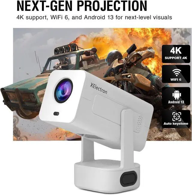 XElectron Techno Rotatable Smart Projector with Auto & 4D Keystone Correction Android 13 Smarter, Smoother, and More Secure Massive 200 Screen Cinematic Brilliance at Home Ultra Bright Projection Immersive Viewing Redefined Universal Compatibility Connect any device with ease Built-in 20W Speakers Immersive Audio Next-Level Speed & Connectivity with Dual-Band WiFi 6