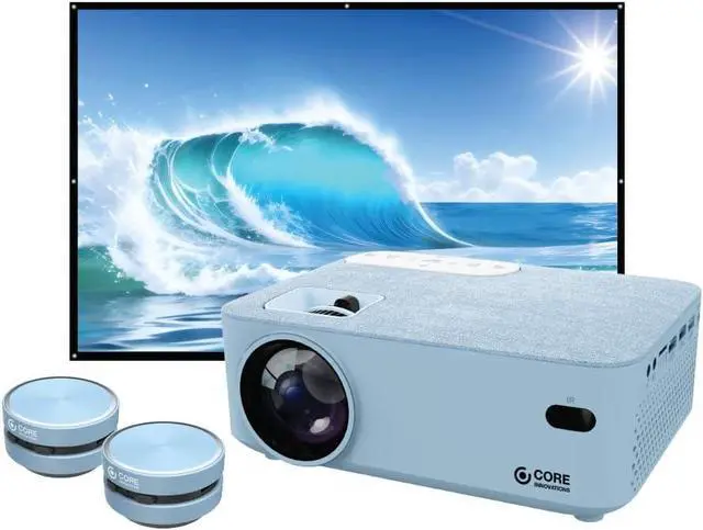 Discover versatile entertainment with this compact projector, featuring a native display resolution of 800 x 480 pixels that ensures crisp and clear visuals. Whether you're streaming your favorite movies or sharing presentations, this projector supports multiple video resolutions, including 1080p and 720p, providing flexibility for various content types.Equipped with advanced LED light technology, the projector offers a brightness of 45 lumens, perfect for enjoying your media in diverse lighting conditions. It operates on a dual power system with DC 12V/3.5A or standard AC 100-240V, 50/60Hz, making it suitable for both home and portable use.Connectivity is a breeze with multiple input options including two HDMI® ports, a USB port, a memory card slot, and AV input. The USB port supports devices up to 1TB, while the memory card slot offers the same capacity, accommodating a wide range of media. You can also connect headphones via the 3.5mm audio output for a more personalized audio experience.This projector supports a variety of image formats such as .jpg, .png, and .bmp, as well as audio formats like .mp3 and video formats including .avi, .mp4, and .mov. Enjoy seamless media playback and share your content with ease using this feature-rich and user-friendly projector. Turn any space into your personal theater with the Core Innovations Home Theater Bundle! Perfect for movie nights, presentations, or gaming marathons, this bundle includes everything you need for a captivating viewing experience. With a high-quality projector, a 120" projector screen, and two wireless bone conduction instant speakers, your entertainment will be taken to the next level with clear visuals and a personalized sound experience. The two wireless instant speakers included in the bundle bring a whole new dimension to sound. Using advanced bone-conduction technology, these speakers transform any hollow objectlike boxes, buckets, or even a wallinto an amplifier. Complete your setup with the included 120-inch foldable projector screen, offering a massive, theater-like viewing experience. Perfect for indoor movie nights, outdoor parties, or professional presentations, this screen ensures that every detail is brought to life with vibrant color and clarity.