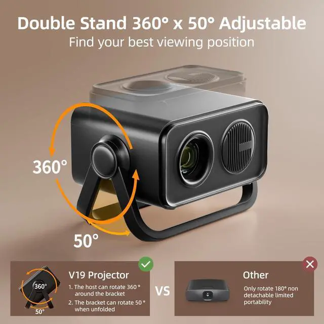 Fully Adjustable Dual Stand Built-in dual 360° x 50° adjustable stands let you easily position your projector on any surfaceno tripod needed. Compact and ultra-portable, its your ideal travel companion.