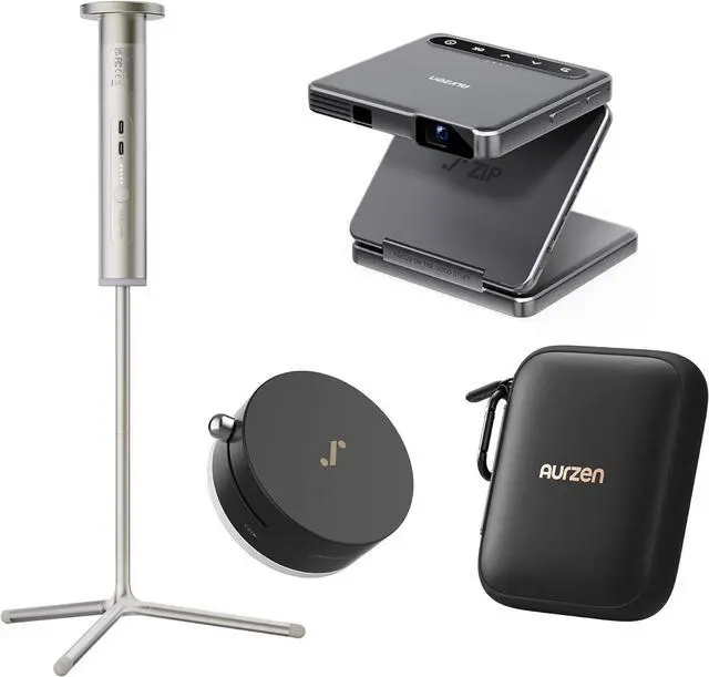 Aurzen ZIP Tri-Fold Truly Portable Grey DLP Projector with PowerPlay Stand + CasePlay+ MagPlay Mount Zero-Lag Focus, One-Click Screen Mirroring, 3H Playtime