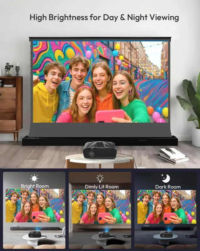 [Bright Room Daytime Projection] With 2300 ANSI lumens3× brighter than regular modelsthe A9T delivers crisp, vibrant movies even in sunny living rooms. Adaptive brightness technology adjusts from dawn to dusk, so you can enjoy every scene without closing curtains. Perfect projector that works with lights on, outdoor movie nights, or bright room entertainment