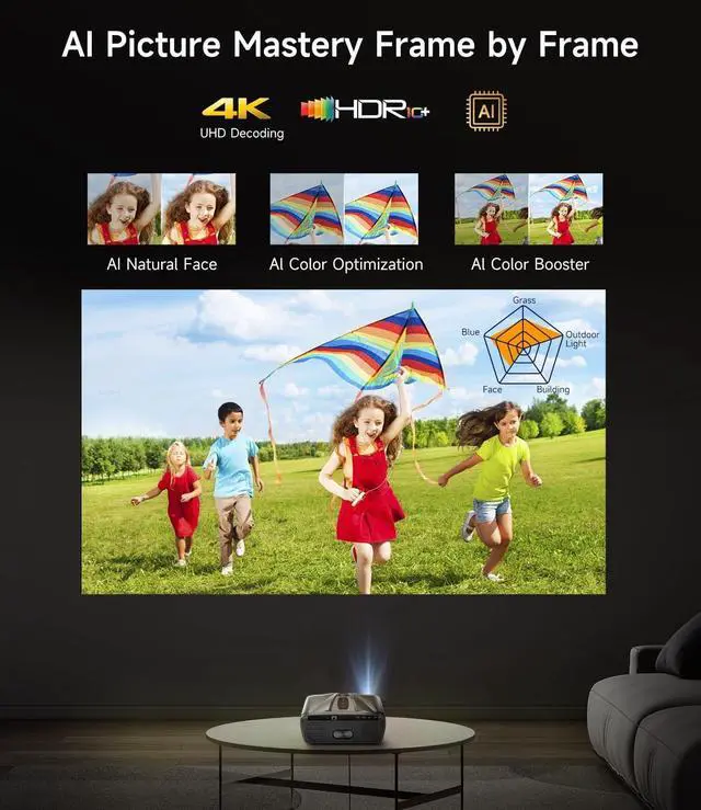 [True 4K UHD Projector - Cinema-Grade Color Accuracy]4K decoding with HDR10+ & HLG support delivers stunning ultra HD visuals with professional-grade precision. Advanced 6-color LED light source technology renders 98% DCI-P3 wide color gamut for true-to-life, vibrant colors that rival premium cinema displays.D65 Factory-calibrated color accuracy ensures consistent, authentic visuals whether streaming Youtube in your home theater, gaming on PS5, or hosting backyard movie nights. AI-enhanced picture processing optimizes every frame automaticallyfrom dark shadows to bright highlightsfor perfect contrast and detail.