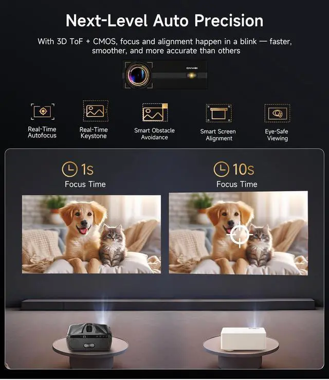 [Short Throw Projector - Smart Fit for Any Space] The A9T's 1.2:1 short throw ratio projects a massive 100" screen from just 8.7ft away33% larger than standard short-throw projectors. 3rd-Gen ToF+CMOS auto-focus, auto-keystone, and obstacle avoidance means setup takes seconds with zero manual tweaking. Perfect short throw projector for small apartments, compact bedrooms, cozy living rooms, or basement home theaters. 40%-100% zoom maintains crisp 4K sharpness from 30" to 300" without repositioning. Enjoy big-screen cinema anywhere without rearranging furniture or needing massive wall clearance