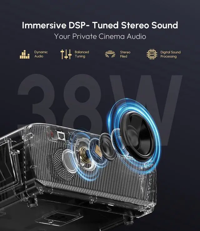[Cinema-Grade Audio System - 38W DSP Surround Sound] DSP-tuned 38W stereo speakers with Bass Boost technology deliver powerful bass and crystal-clear dialogue for authentic theater-grade soundscape. Real-time audio tuning adapts dynamicallyfrom quiet whispers to roaring explosionsensuring every moment feels alive. Connect external soundbar or home theater system via HDMI ARC or Bluetooth 5.2 for richer surround sound experience. Perfect home theater projector audio for movie nights, concert replays, sports games, and gaming sessions. The A9T fills your space with immersive, room-shaking audio that rivals dedicated sound systems.