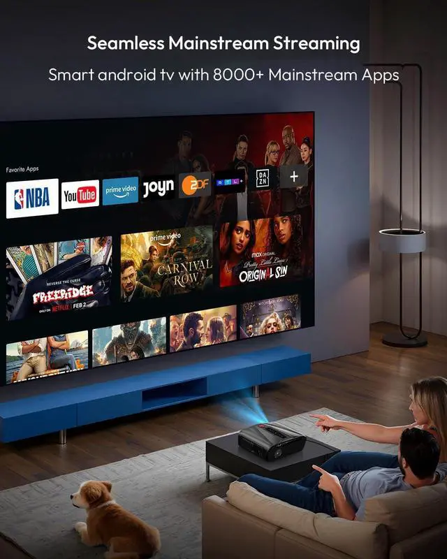 [Smart Android TV Projector - All-In-One Entertainment Hub] Built-in Android TV 11.0 with Netflix, YouTube, Prime Video, and 5000+ appsno streaming stick required. Wi-Fi 6 technology ensures 4K streaming without buffering, while NFC one-tap casting instantly mirrors your phone, tablet, or laptop. Dual-band WiFi projector connects seamlessly to any network, and HDMI 2.1 supports 4K@60Hz from gaming consoles, laptops, and cable boxes. Perfect smart projector for cord-cutters who want Netflix built-in and wireless freedom.