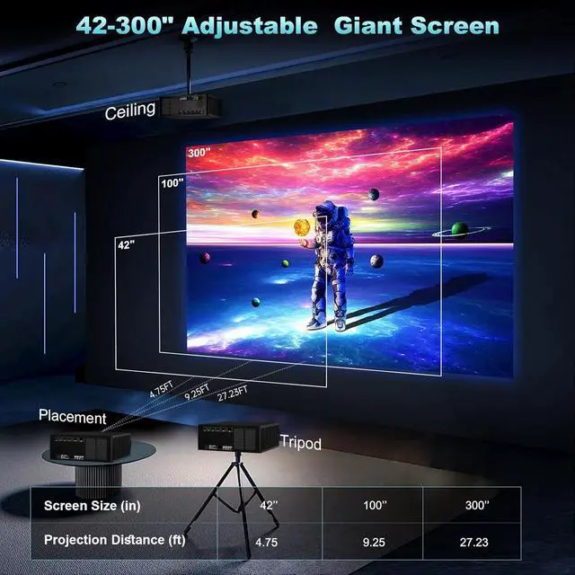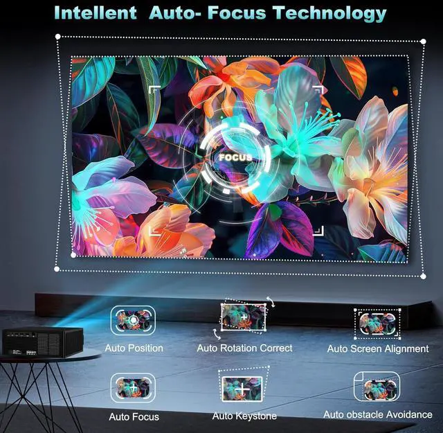 Auto Focus | Auto Keystone Correction | Auto screen AlignmentWith advanced screen adaption algorithm, Mini Projector can recognize movements and response accordingly with accurate and fast focus, obstacle avoidance, keystone, screen alignment and rotation correction fully automatic. This guarantees Wireless Projector a perfect projection image shape from front/side/ceiling position. This ceiling projector has 50%-100% Zooming ability to adjust image size without projector moving.Proyector supports projection onto screens up to 300 inches
