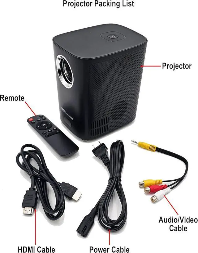1280 x 720 Resolution LED Projector with sound, remote and wide-angle lens formatted for virtual videos.