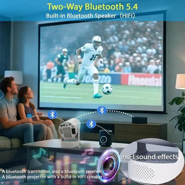 Smart Projector With WiFi 6 and Bluetooth 5.4 & HIFI SpeakerProjector with wifi and bluetooth 4k ultra adopts the latest WiFi 6 connection technology, a few seconds allowing you to play games and watch movies without delay. Built-in Bluetooth 5.4 chip, connect to various Bluetooth speakers/headphones without a cable (avoid disturbing your neighbors). Wireless wifi projector is entirely unencumbered by wired connections. HIFI speakers on bottom of small projector offer a cinema sound effect.