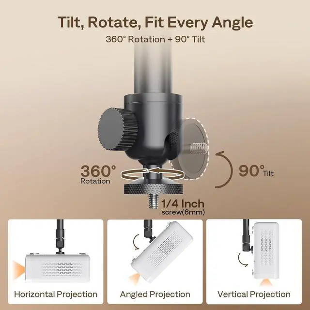 Full Motion Adjustability 360° Rotation & 90° Tilt: Upgraded adjustable projector mount supports 360° rotation and 90° vertical tilt for optimal viewing angles in home theater or office setups