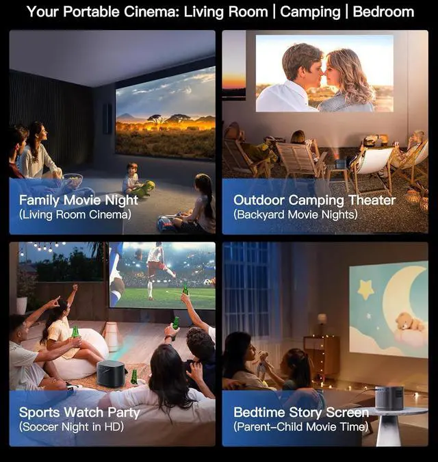 Compact & Portable Projector: Take Cinema AnywhereJust 7.87*5.91*6.30 inch and weighing only0.86kg (1.9 lbs) .You can take it anywhere with ease, whether you're traveling, hosting an outdoor movie night, or setting up a home theater in any room. Project 45"-200" screens from just 1.25-4m (4-13 ft) perfect for camping under stars or dorm room marathons.(NOTE: No Battery Included in projector)