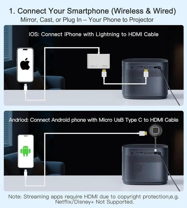 3 Ways to Play: Netflix, Phones, Consoles & More Stream ANYTHING: Plug Fire Stick/Roku (not included) into dual HDMI 1.4 ports Bypass HDCP to watch Netflix/Prime Video/Hulu without blackouts. Phone/Cast Screen: Connect iOS/Android via USB + MHL/Lightning adapter (not included) for mirroring. Direct HDMI Play: Hook up laptops, PS5/Xbox, or Blu-ray players instantly. ((NOTE: No WiFi/Bluetooth. HDCP requires TV Stick for streaming apps)