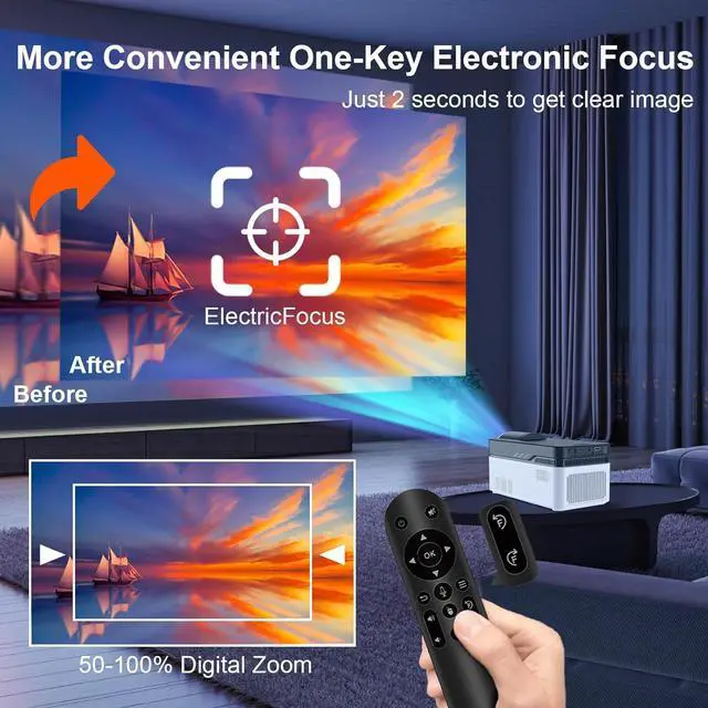 Auto Keystone Correction & Electric FocusPerfect picture, instantly achieved. No more blurry images or distorted rectangles! Smart auto vertical & horizontal keystone correction detects the projector's angle and instantly squares the image in rectangle. Combine this with precision motorized electric focus easily adjust sharpness using the included voice remote control or buttons. Effortless setup anywhere makes this the most smart 4k projector for hassle-free viewing.