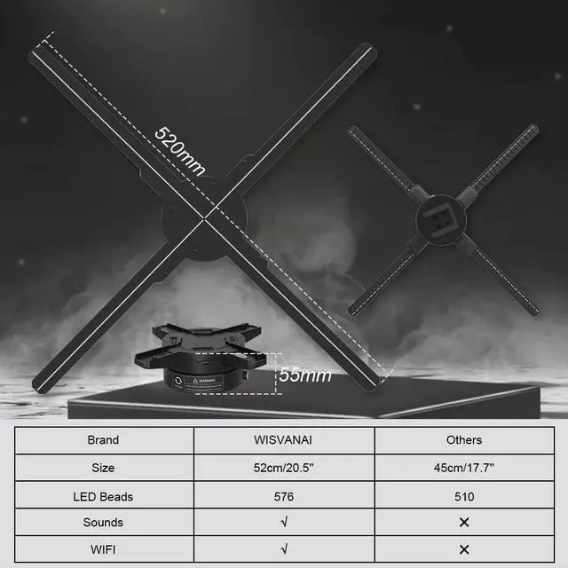 Bright Adjustable: The bright of the 3D hologram fan can be adjusted. According to your needs, you can adjust the bright of the advertising projector with the App.