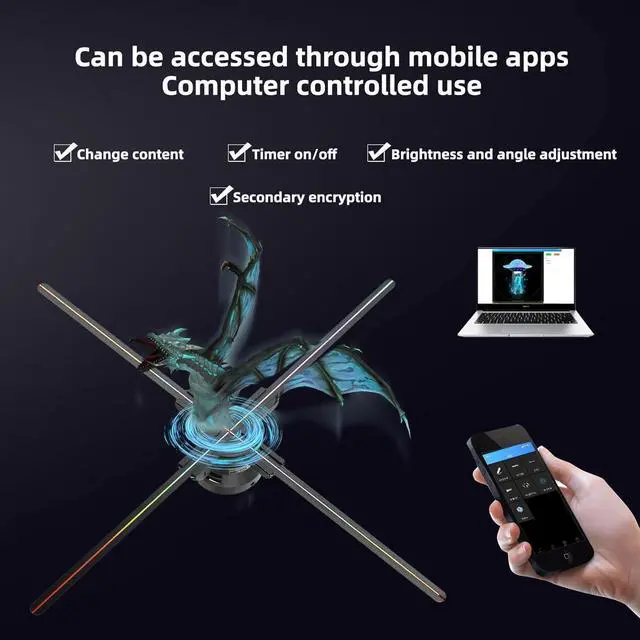 App-Controlled Content Management for Ease and Convenience The Missyou 3DHologramFan can be controlled remotely through an app, allowing users to change video content easily from their smartphone or computer. This fan is WiFi-enabled, and the app works with both iOS and Android devices. With just a few taps, you can upload new video content and instantly change the visuals. Whether you want to showcase holiday animations, promotional videos, or custom logos, this feature makes managing your content effortless. Perfect for those looking to keep their displays fresh and up-to-date