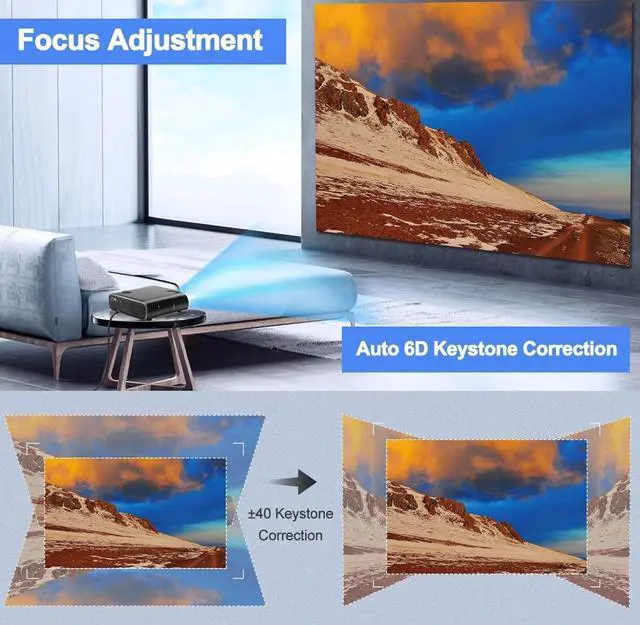 Effortless Setup with Auto 6-Point Keystone Correction No more manual fiddling! Our advanced Auto 6-Point Keystone Correction instantly transforms skewed images into perfect rectangles, even when placing the projector at an angle. Enjoy the freedom to set up your projector anywhere in the room and get a perfectly aligned picture within seconds.