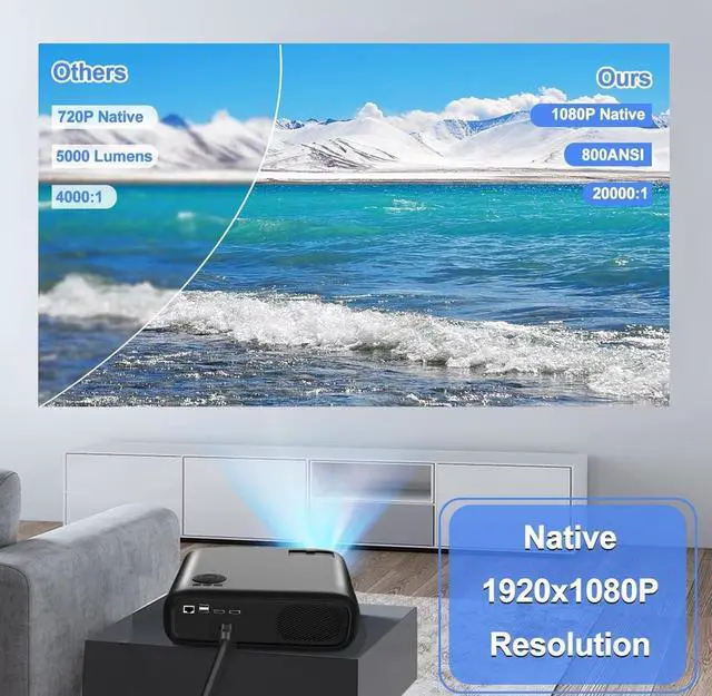 Crystal-Clear 1080P Full HD & 800 ANSI Lumens Experience breathtaking clarity with native 1920x1080 resolution and 800 ANSI lumens brightness. This projector delivers a highly-detailed, vibrant, and sharp image with a 20,000:1 contrast ratio, ensuring every corner of the screen is brilliantly lit. Perfect for movies, sports, and gaming, it brings a true home cinema experience to your living room or backyard.