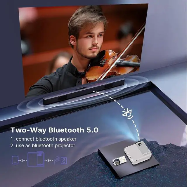 Two Ways Bluetooth ConnectionThe mini projector with WiFi and Bluetooth supports two-way bluetooth audio. You can connect it to a mobile device or external speakers to enhance the audio of the home projector. The home theater projector supports 360° surround sound for a great experience. Tip:The Bluetooth projector only supports audio