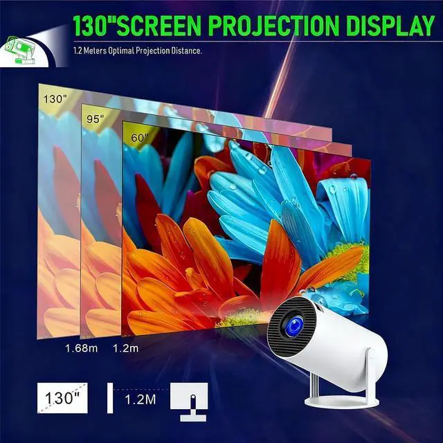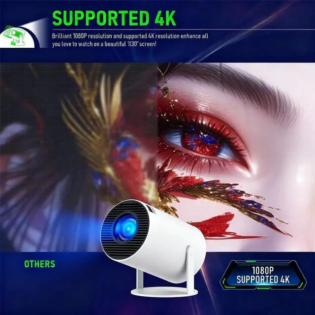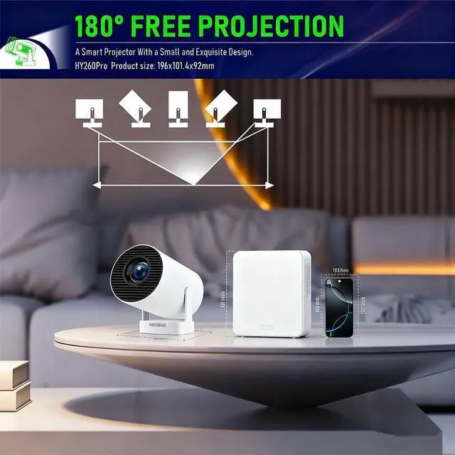 210° Projection, Auto Vertical KeystoneThe mini portable projector 4k support 210° Rotating Bracket Lets You Project on Walls, Ceilings, Or Angled Surfaces. Short-Throw Design Creates a 100" Screen from Only 2m. Auto Vertical Keystone and ±15° Horizontal Correction Keep Images Aligned. Ideal Projects