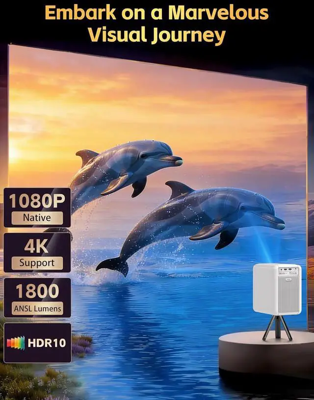 Brilliant 1080P Picture, 4K SupportedMovie Projector with Native 1080P Full HD clarity that seamlessly supports 4K content input. With a 1800 ANSI Lumen, it cuts through ambient light to deliver vibrant, You can watch movies or play games on screen in the room, and use screen mirroring for office work in the conference room , transforming any space into a versatile home theater.