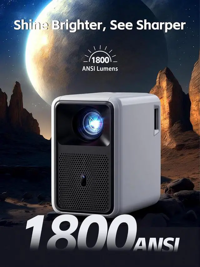 1800 ANSI Smart ProjectorThis projector has 1800 ANSI lumen, providing bright and vivid images, clear text, rich colors, higher brightness compared to lower brightness models, and a good balance of performance and value among similar products. It perform clearly in the room, eliminating fading or blurry visual effects. From movie scenes to presentation charts, the content looks lively and attractive. It is better for home , meetings, or online learning, supporting movies, games,and presentations, get a comfortable feel.