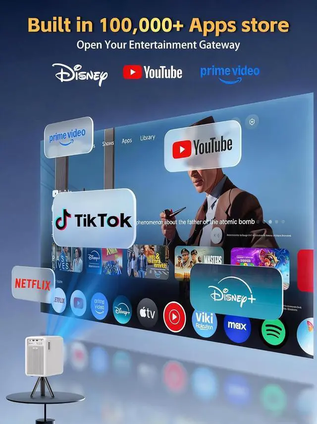 Built in streaming systemNo additional equipment required. This smart projector allows you to access over 1000 applications, including Netflix, Prime Video, YouTube, and Disney. It has the convenience of plug and play, making watching movies convenient and fast. The system itself comes with applications, and if you want to use other apps, you can download them from the app store.