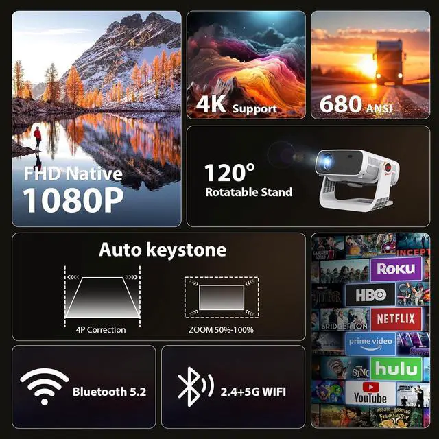 Native 1080p 4k support: Experience crystal-clear video with this 4k projector.Ideal for movie projector for outdoor use or as a projector for bedroom. Auto keystone & zoom ensure a perfect screen every time.