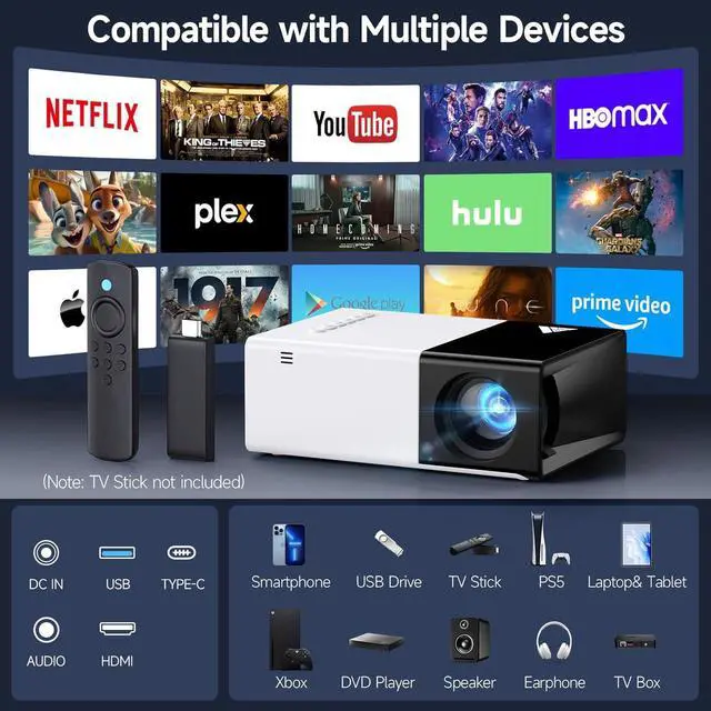 Plug & Play Streaming ReadyInstantly transform your video projector into a smart entertainment hub! This Nasin small projector works flawlessly with Fire TV Stick, Chromecast, Roku, and all major streaming devices (bought separately). Enjoy seamless access to Netflix, Disney+, YouTube and all your favorite platforms in stunning big-screen clarity - no complicated setup required! (Note: Streaming devices not included)