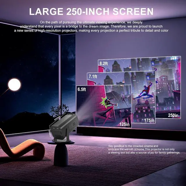 Big Projection Size: 250 inch large projection screen brings an immersive viewing experience. phone projector allows you to enjoy the happy home theater time with your family both indoor or outdoor. The outdoor projector provides a projection size from 35 to 250 with the projection distance between 3.7ft to 24 ft. Optimal projection distance is 6.5 feet-8.2