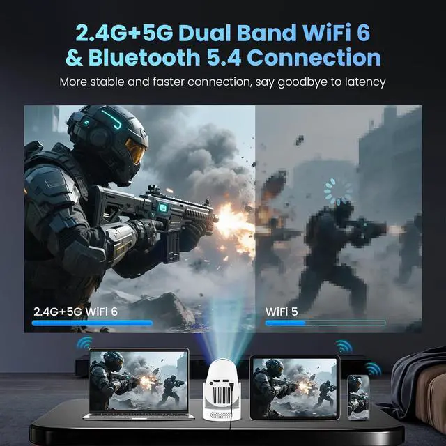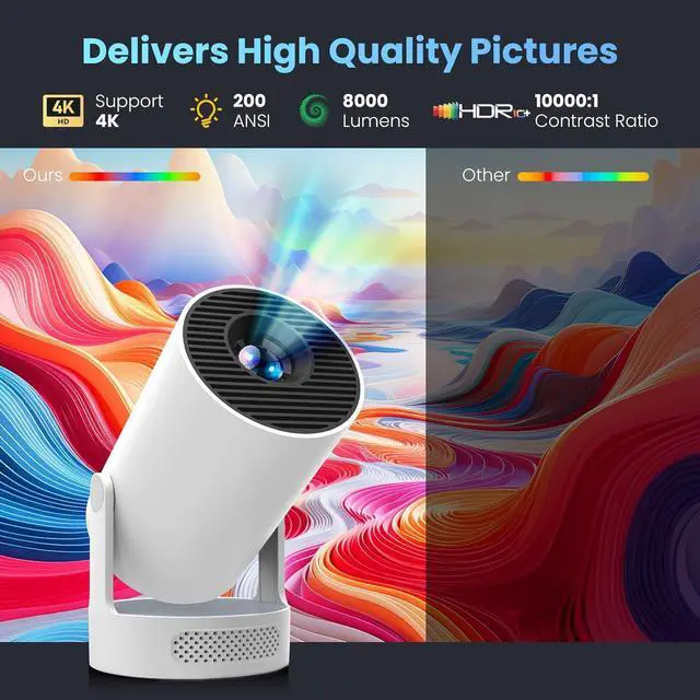 1080P HD Projection: Supports 1080P/4K resolution to provide clear visual effects. Seamless connectivity with the latest WiFi 6 and Bluetooth 5.4 ensures smooth streaming, and it's also compatible with 2.4G and 5G networks and features Bluetooth 5.4 to connect to your favorite devices. With 8000 lumens of brightness and a 10000:1 contrast ratio, this projector delivers stunning visuals, ensuring vivid colors and crisp details.