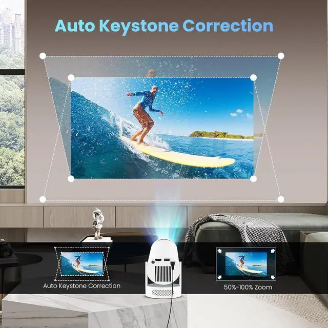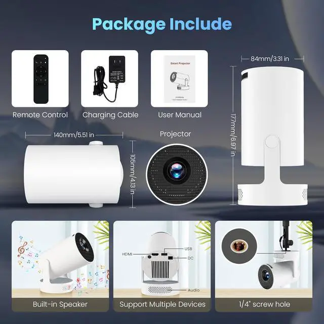 Auto Keystone Correction and Surround Sound: The mini projector integrates an automatic keystone correction function to quickly adjust the image to the ideal state, and with manual focus adjustment, you can get a clear image instantly. In addition, the built-in 360-degree surround sound system creates an immersive listening experience, making every movie viewing an audio-visual feast.