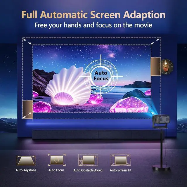 12000 ANSI Lumens 2360° Rotating Stand3Official Licensed Apps436W Stereo DoIby Audio 11:1 Short Throw Ratio2Auto Image Adjustment3Two-way Bluetooth4WiFi 6 Tech1Excellent Image Quality2Multiple Connections3Indoor Home Theater4Outdoor Projector Brightness2000 ANSI LumensResolutionNative 1080P support 4K decodingsupport 60Hz refresh rateZoom100%-50% zoom out functionImage AdjustmentAuto Focus, Auto Keystone, Auto Screen Alignment, Auto Obstacle AvoidanceAudio36W Inner Speakers, Stereo surround, DoIby Audio supportedCompatible Voltage100-240V~50/60HZPreloaded AppsNetfIix, Youtube, Prime video, Disny+, HuIu. NOT support adding other apps. ConnectivityHDMI, USB, AV, 3.5mm Audio JackThrow Ratio1:1( 99% other lcd projectors have 1.35:1 throw ratio) Contrast Ratio50000:1Ceiling Mount Screw SizeM4Adjust Stand Range360°RemoteNeed 2 extra AAA batteriesLED Lamp Lifespan100,000 HoursApplication ScenarioIndoor home theater, Outdoor movie nights, Gaming, Sports Watching, Parties & GatheringsNoteThe projectors ultra-high brightness requires the internal fan to run at high speed for effective cooling, which may result in some noticeable fan noise when standing nearby. What are the advantages of this projector compared with other 1500 ANSI lumens machines?