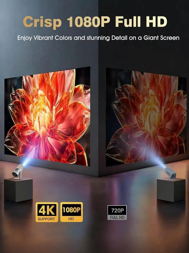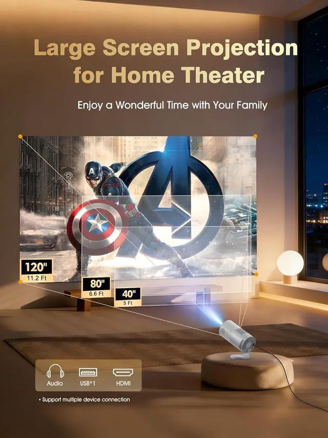 Native 1080P with 4K Support: This mini projector delivers native 1080P resolution and supports 4K content, providing clear detail and vibrant color. It projects a flexible screen size from 40 to 120 inches, with a throw distance between 5 and 11.2 feet, fitting various room sizes. From a bedroom to a home theater or a conference room, it displays a large, clear image without sacrificing detail or size.