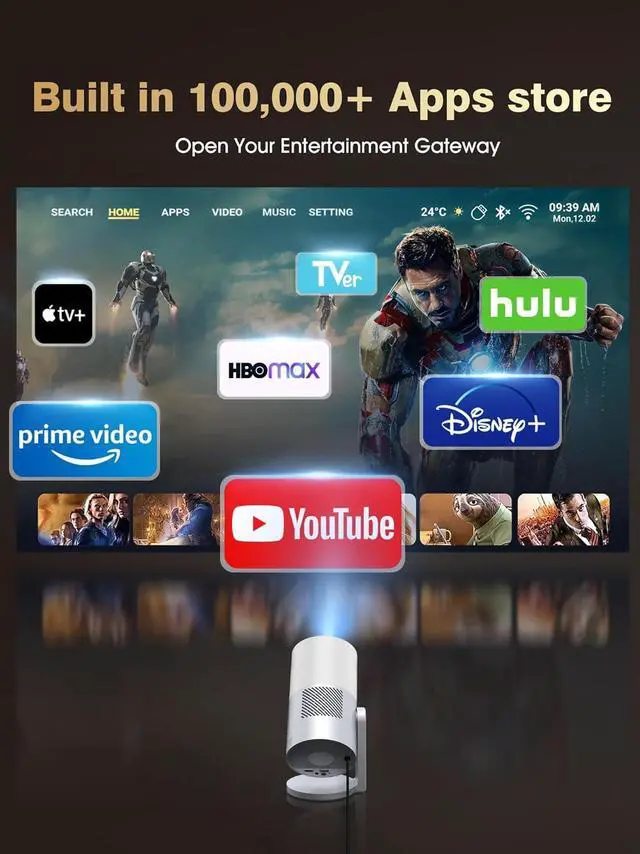 Versatile Ports & Smart System: This projector is equipped with multiple ports for flexible connectivity, including HDMI for gaming consoles and streaming devices, AUX for audio output, and USB for media playback. The built-in Smart System operating system provides access to apps like Netflix, YouTube, and Disney+. The interface allows smooth navigation and supports regular updates, offering a straightforward way to set up a media center on any surface.