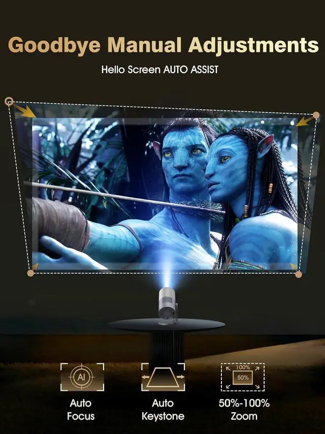 Bluetooth & WiFi 6 | Auto-Focus & Auto Keystone Correction: Connect and begin use quickly. Equipped with dual-band WiFi 6 and Bluetooth 5.0, this projector supports stable, high-speed streaming from phones, tablets, or laptops. Upon connection, its smart sensor activates automatic focus and automatic keystone correction, ensuring a clear, rectangular image without manual adjustment. The wireless features also support screen mirroring and connecting to external speakers.